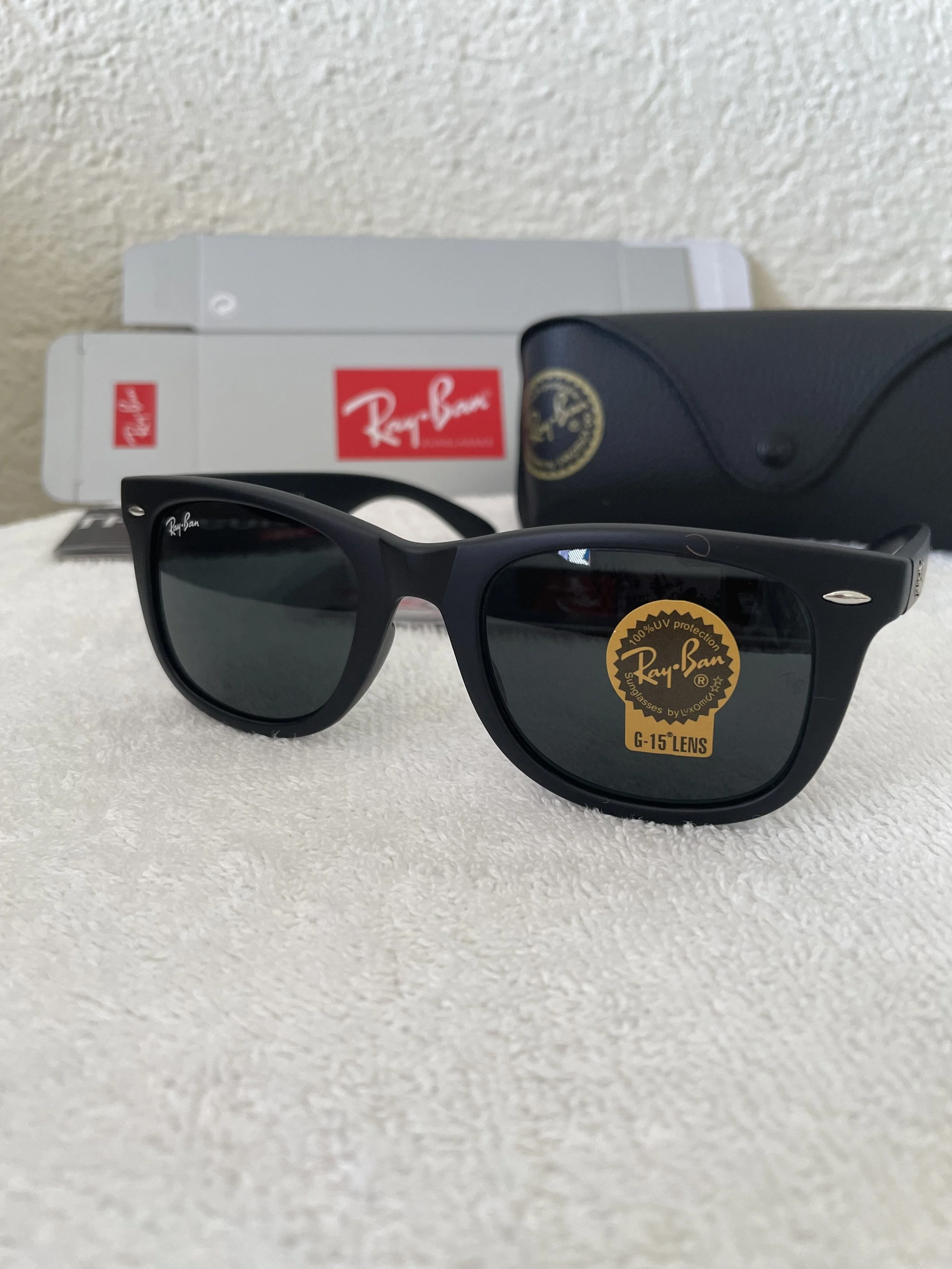 Ray- Ban sunglasses comes in a box with a sunglasses case.